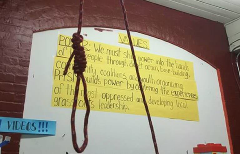 蘇翁 (Sarath Suong),普落威頓斯青年學生運動 (Providence Youth Student Movement) 的執行長,說這起事件大概發生在上星期天下午到星期一早上之間。大部分的闖入都是些小事件,像是把椅子疊在一起,或是把剪刀和尺用奇怪的方式排列等等,但是竟然有一件可怕的事:天花板掛下了一個吊人的繩圈。