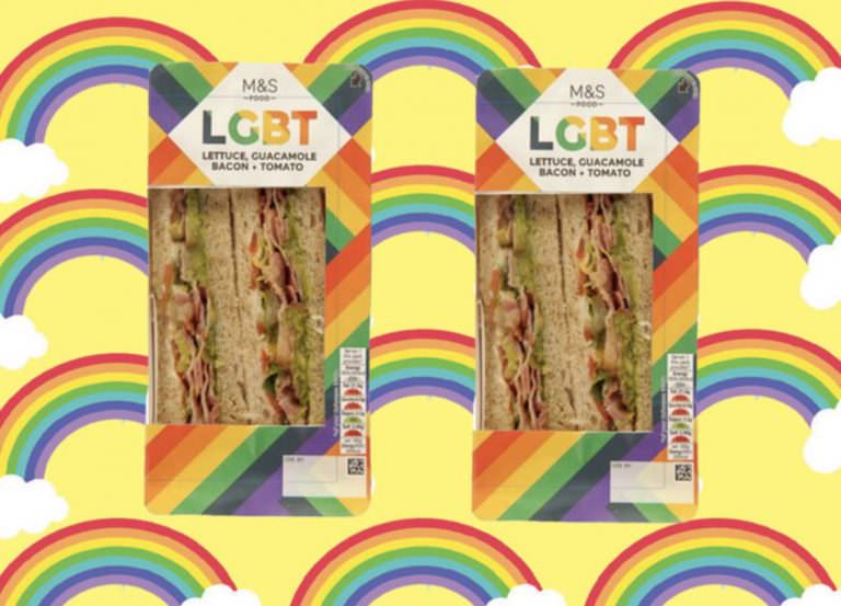 英國知名連鎖百貨公司「馬莎百貨」(Marks & Spencer) ,在今年驕傲月推出彩虹的「LGBT三明治」呼籲大家支持LGBT族群,有趣可愛的此款LGBT三明治,是真的名副其實的LGBT,它包含了生菜(Lettuce)、酪梨莎莎醬(Guacamole)、培根(Bacon)、番茄(Tomato)等四樣食材,搭配彩虹的包裝設計來呼應同志驕傲月。